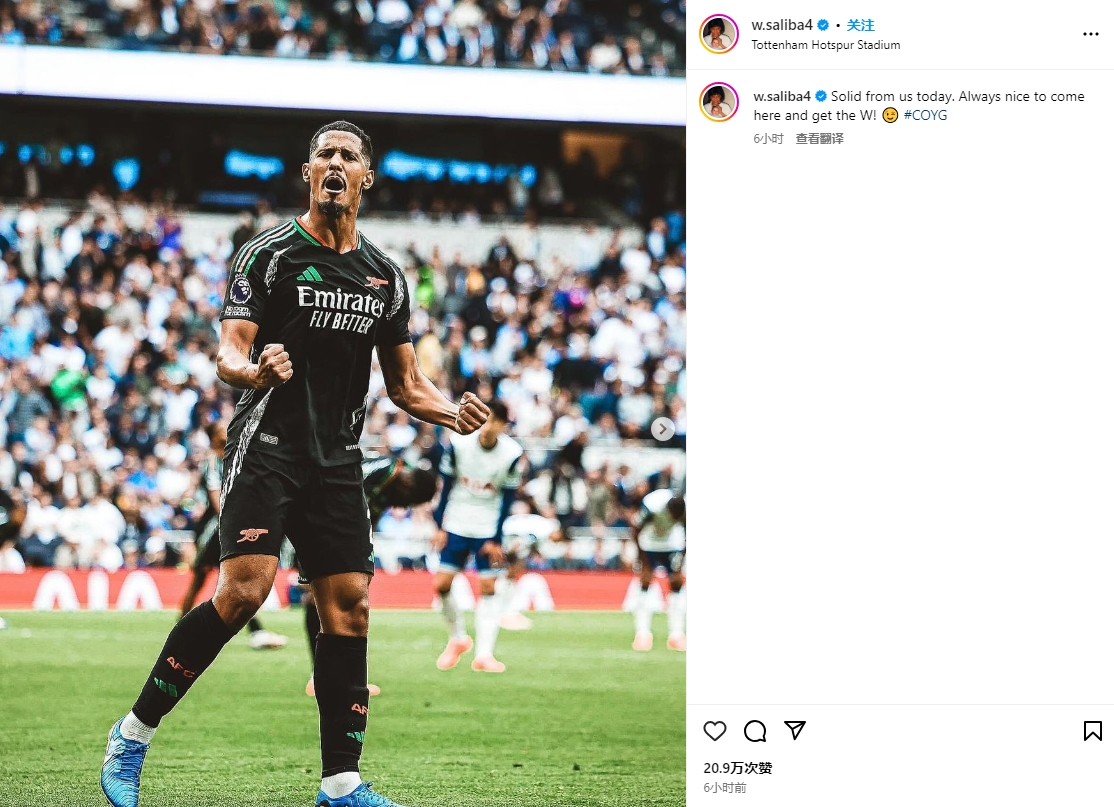 北京时间上周日晚,阿森纳客场1-0战胜热刺。赛后,阿森纳后卫萨利巴更新了个人社交媒体,他写道:“今天我们拿出了稳定的表现,来这里赢得胜利是愉快的事情。”