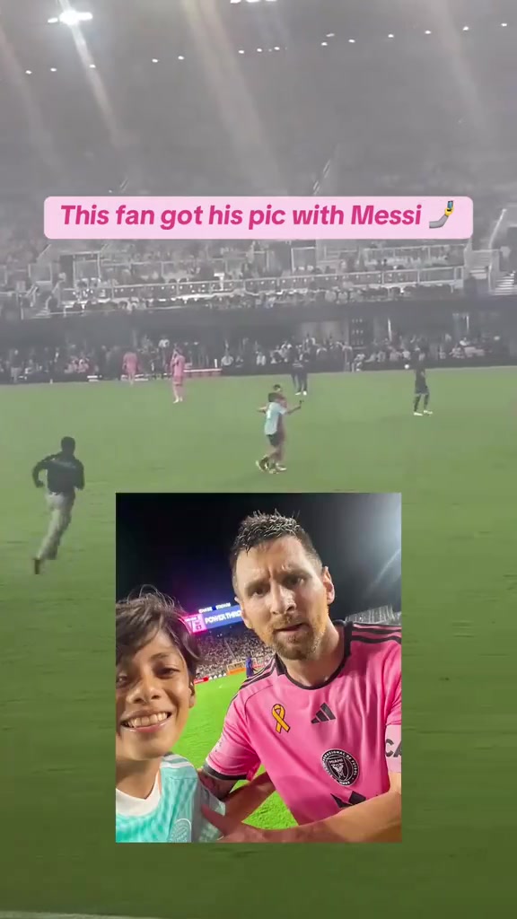 10月1日讯 本轮美职联,迈阿密国际1-1战平夏洛特FC,比赛中一位小球迷冲进场内和梅西合影。