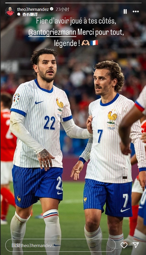 特奥致敬格列兹曼:很自豪在你身边踢球,谢谢你所做的一切,传奇 admin 2024-10-02 131 10月2日讯 特奥更新社媒,致敬退出法国队的格列兹曼。9月30日,33岁攻击手格列兹曼宣布退出法国国家队,他自2014年3月首次代表国家队出战以来,总计上场137次,打进了44球,并有38次助攻。在个人社媒,特奥晒出与格列兹曼在法国队的合影,同时配文:“很自豪在你身边踢球,谢谢你所做的一切,传奇。” The End 标签:谢谢你所做