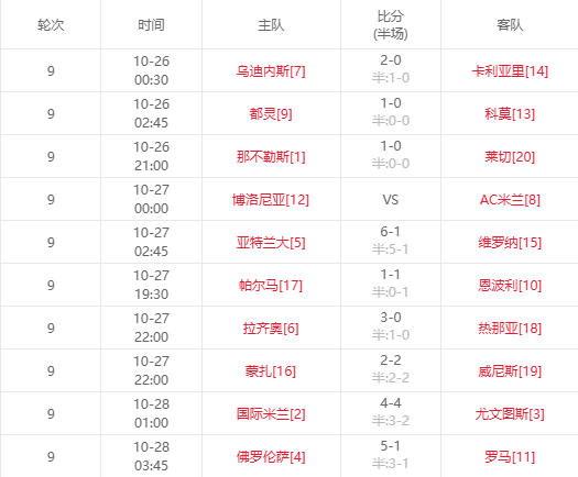 上周末,本赛季意甲第9轮全面打响,除了博洛尼亚对阵AC米兰的比赛因场地原因推迟外,其余9场比赛均已战罢。